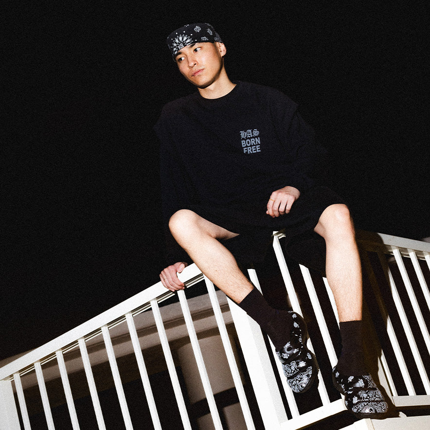 Like champagne in a camp mug. this lightweight men’s clog is the effervescent hero of the day. Celebrated with a vintage bandana pattern from fashion brand Hide and Seek.